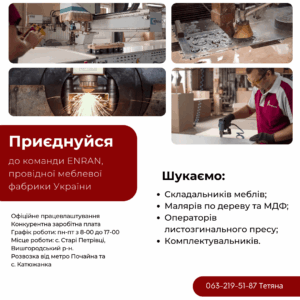 Компанія Enran — провідна меблева фабрика повного циклу виробництва. Ми створюємо інтер’єри для житлових та комерційних приміщень. Наше виробництво — це поєднання традицій майстерності та сучасних технологій. Ми шукаємо відповідальних фахівців, готових працювати на результат.